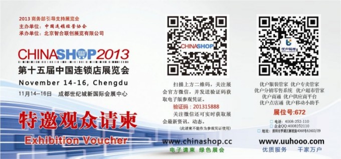 邀請函尊敬的合作伙伴:優(yōu)戶科技誠邀您參加第十六屆中國連鎖店展覽會(huì) ! 此次展會(huì),我們將以O(shè)2O場景模擬化的形式搭建展會(huì)現(xiàn)場,通過技術(shù)手段,帶您體驗(yàn)真正的O2O解決方案,讓企業(yè)落實(shí)O2O不再是一句空話! 打通數(shù)據(jù)壁壘--與進(jìn)銷存系統(tǒng)、收銀系統(tǒng)對接,實(shí)現(xiàn)線上線下數(shù)據(jù)打通,即時(shí)共享。O2O平臺(tái)--PC商城、微信商城、APP,三個(gè)流量入口一網(wǎng)打盡!微信支付--通過微信掃碼購,讓支付變得簡單!微...