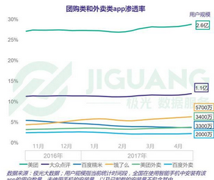 極光大數(shù)據(jù)的報(bào)告還顯示,截至今年4月,美團(tuán)用戶規(guī)模達(dá)2.6億,大眾點(diǎn)評(píng)為1.1億,餓了么為5700萬(wàn),百度糯米為3300萬(wàn)。DAU方面,餓了么4月份日活達(dá)380萬(wàn),同期,美團(tuán)外賣為220萬(wàn),百度外賣為87萬(wàn)。